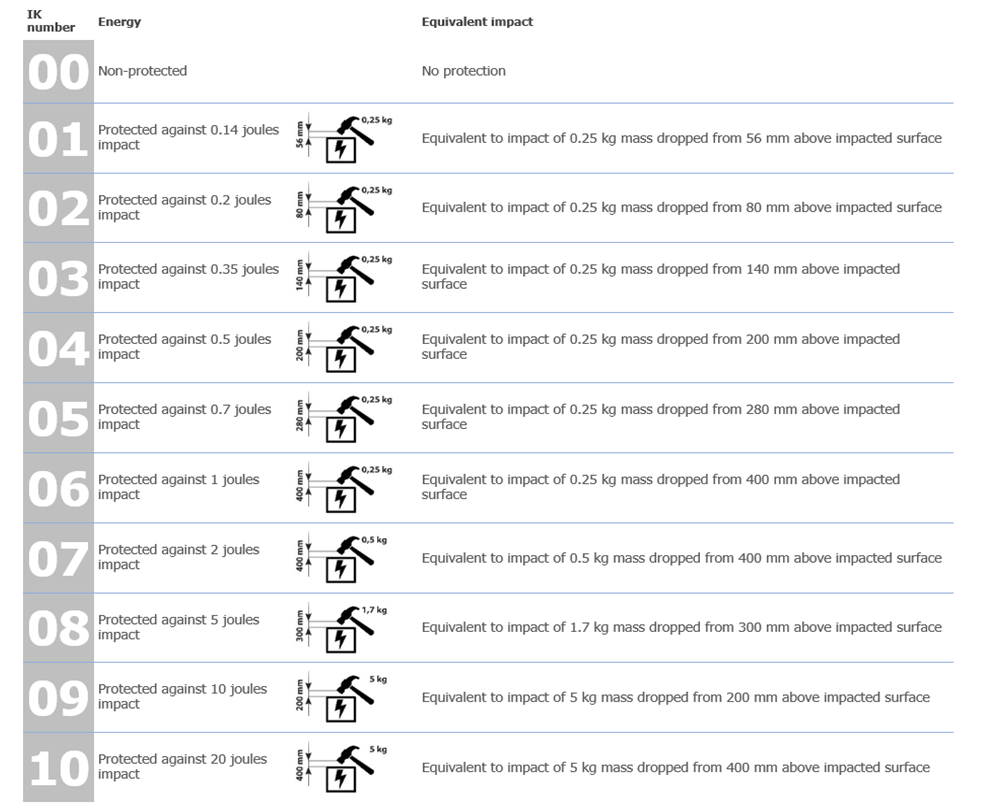Degrés de protection procurés par les coffrets des équipements électriques contre les chocs mécaniques externes selon CEI 62262: 2002 et CEI 60068-2-75: 1997.